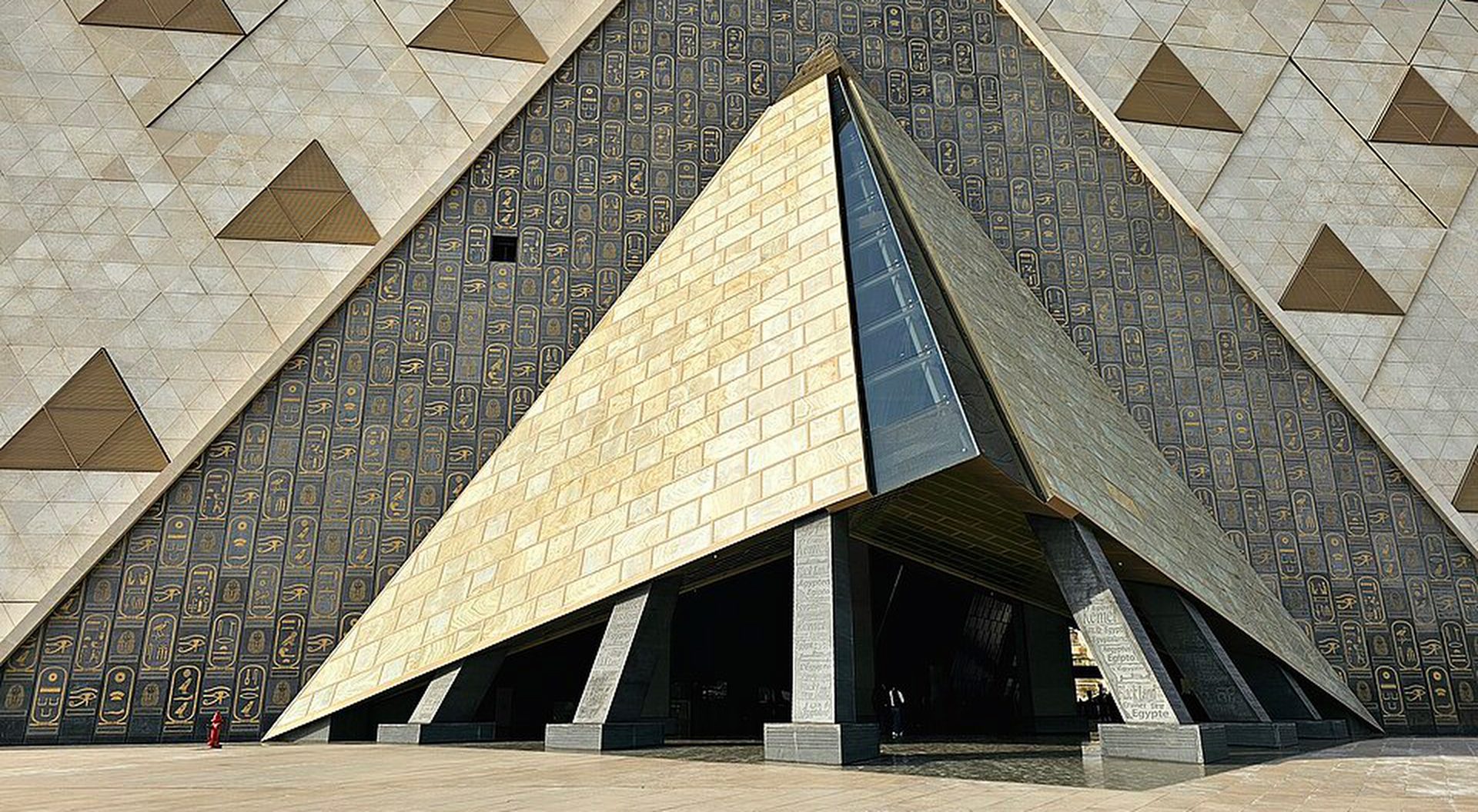 O Grande Museu Egípcio é um exemplo impressionante de arquitetura moderna aliada à sensibilidade histórica. O edifício principal possui um design angular, com fachadas de vidro que reflectem a luz do deserto, criando uma conexão visual com as pirâmides de Gizé próximas. A entrada principal é monumental, projetada para conduzir o visitante a uma experiência imersiva desde os primeiros passos dentro do museu.