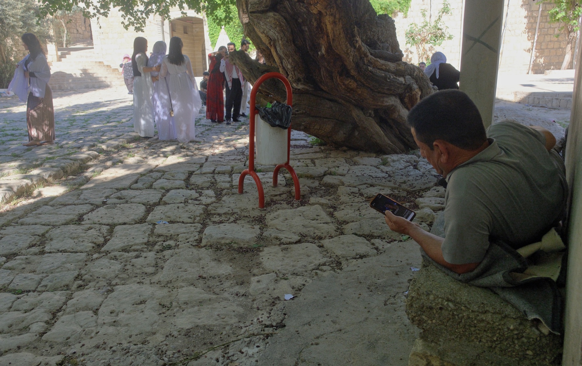 Os olhares que recebemos são de curiosidade. Uma família de yazeeds mete conversa. Vêm em peregrinação desde Bagdade. Outros vivem na Europa, falam bem inglês. Enquanto o Shaian procede às suas explicações alguns chegam-se, curiosos de ouvir o que está a ser dito.