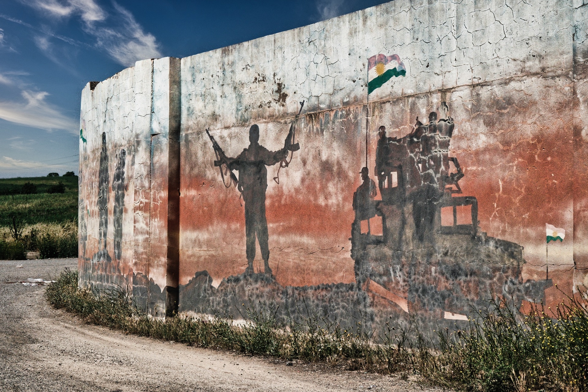 De barriga cheia e bem cheia começamos a rodar em direção a mais um dia de viagem. mas não será preciso muito até que chegue a primeira paragem. Num ponto insuspeito, sem mais nada em redor do que campos de lavra e um estradão de terra batida, encontra-se um longo mural. Aqui tira-se o chapéu ao guia. Um pequeno segredo escondido. É literalmente um mural, já que o que ali vimos é um longo muro. Todo decorado com temas da resistência curda. A viatura deixa-nos no início e avança para o fim, onde nos recolhe. Um bom momento.