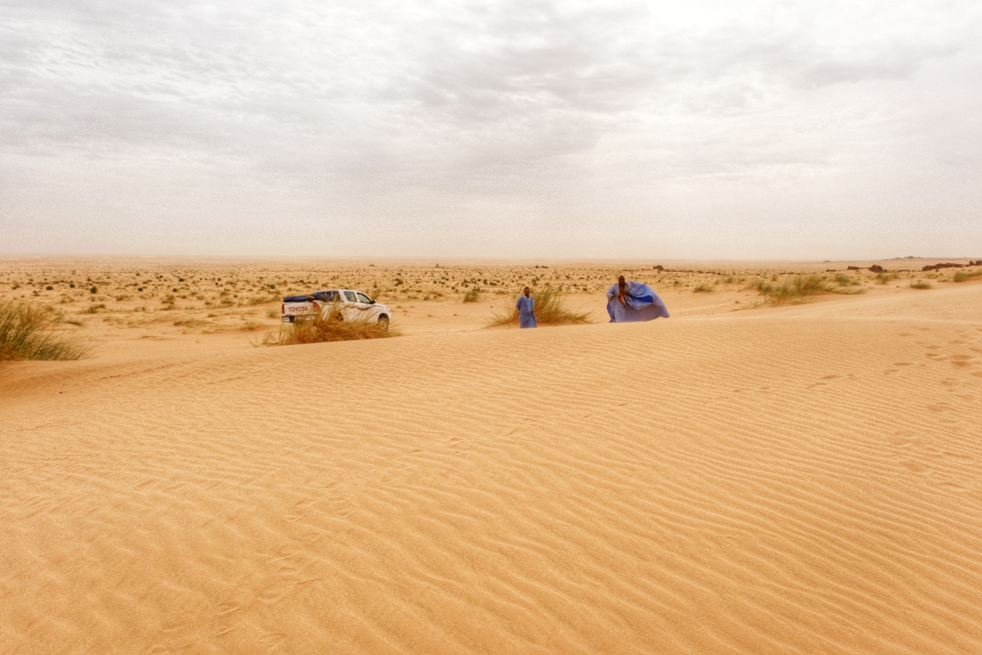 Hoje foi um dia de muitos caminho e pouco lazer. Mas valeu! O Rocher de Makhrouga é uma maravilha geológica que deixa qualquer um fascinado. Encontra-se junto ao trilho que liga Oualata a Tichit. Este, está marcado como uma estrada no Google Maps, mas na realidade não é nada mais do que puro deserto com umas marcas de rodados, que mesmo assim apenas são visíveis a espaços. O resto fica entregue ao nosso génio da navegação em deserto, o homem ao volante, o incrível Havel.